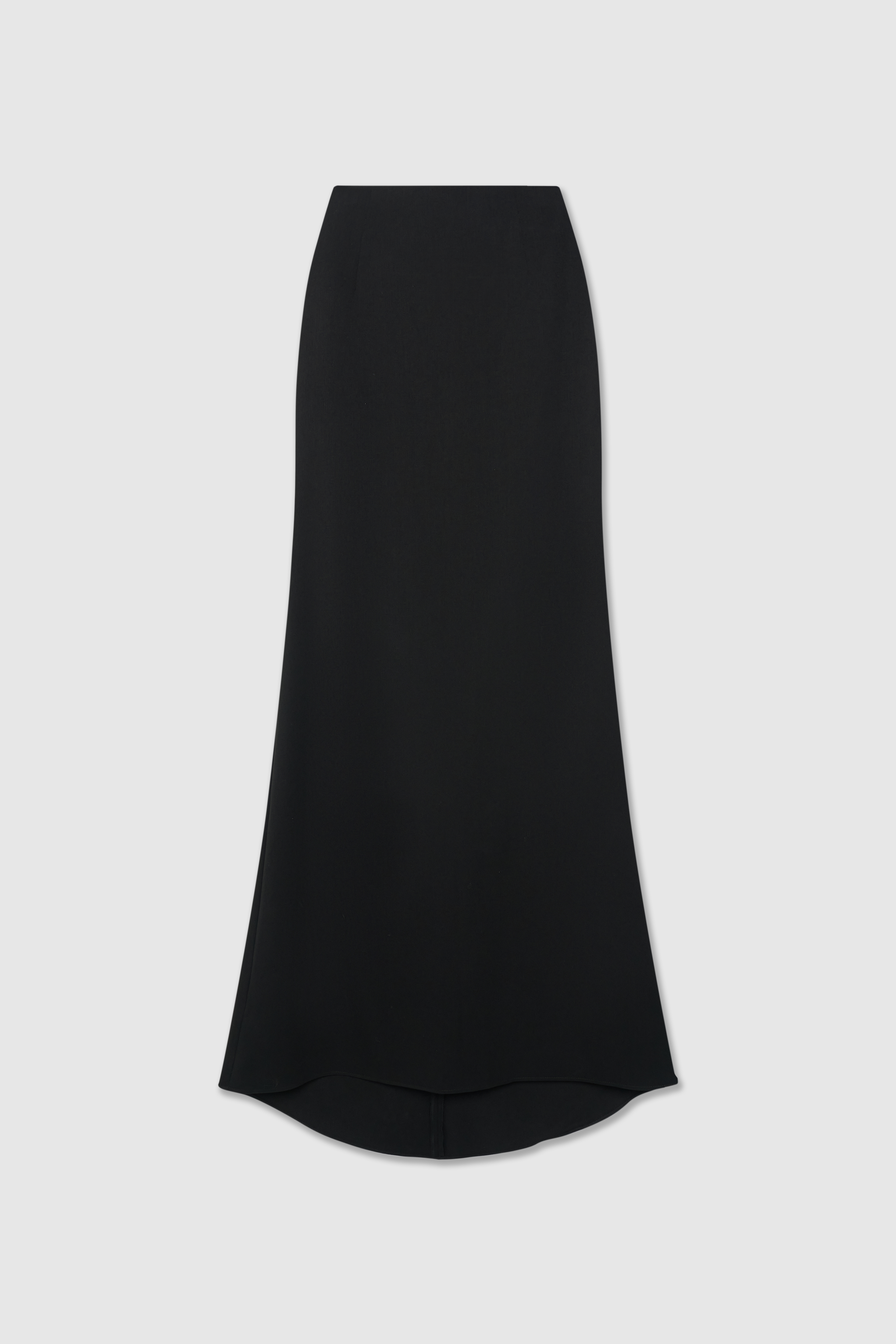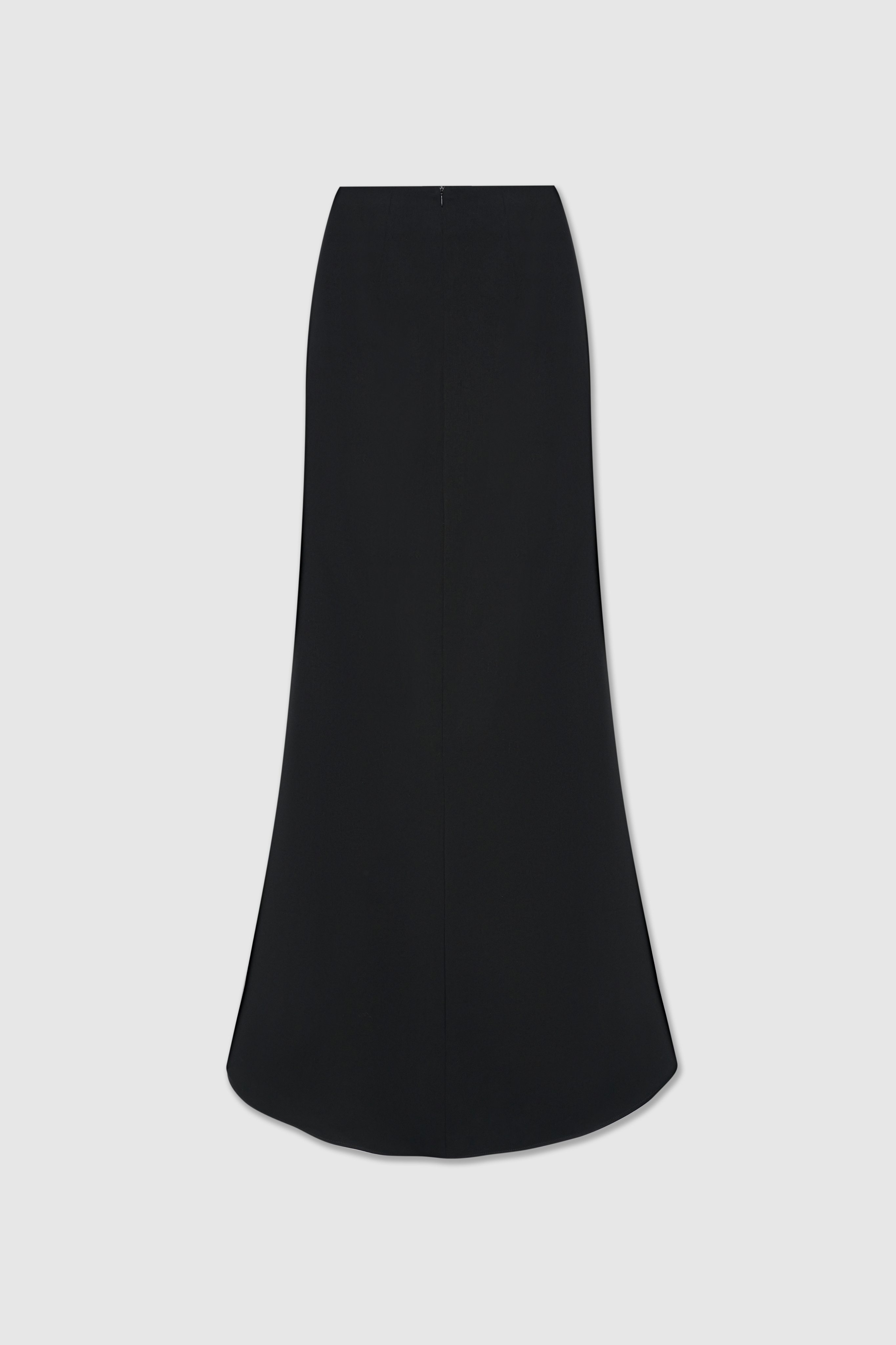 Юбка макси из благородного шерстяного драпа черного цвета сочетает в себе лаконичность силуэта и безупречное качество. Плотная, формоустойчивая ткань с мягкой текстурой сохраняет тепло и держит форму. Благородный черный цвет легко сочетается с любой палитрой гардероба. Чистые линии и отсутствие пояса создают вытянутый, стройный силуэт. Потайная молния сохраняет лаконичность дизайна, а подклад из шелковистой вискозы обеспечивает комфорт. Немного удлиненный шлейф на задней стороне изделия.
