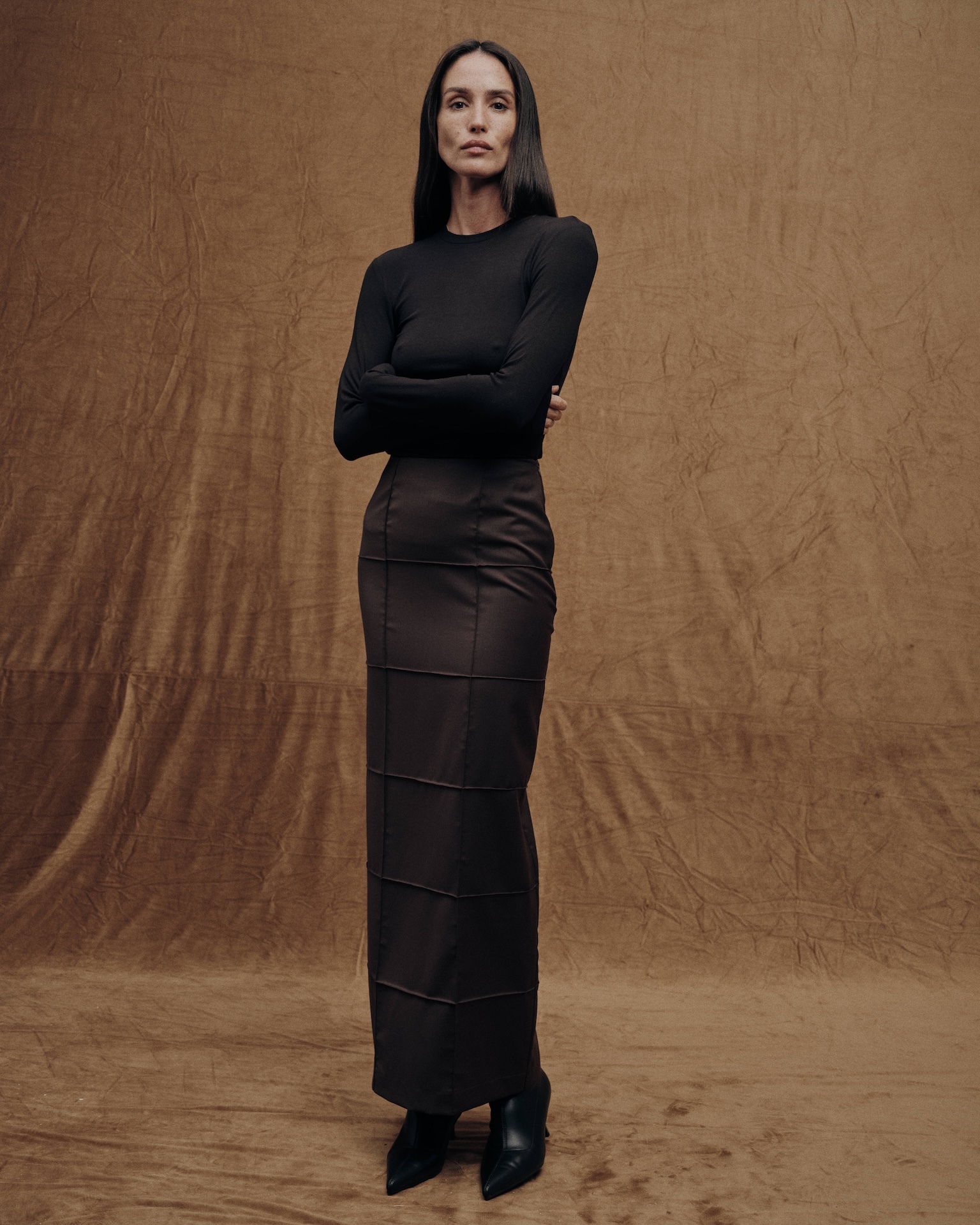 Юбка из костюмной итальянской шерсти. Декоративный элемент - архитектурная стежка квадратами. Декоративные застроченные швы создают тактильный рельеф и сложный геометрический рисунок. Прямой силуэт создает вытянутую, стройную линию. Функциональный разрез сзади обеспечивает свободу движения. Застегивается на потайную молнию. Длина изделия 100 см.